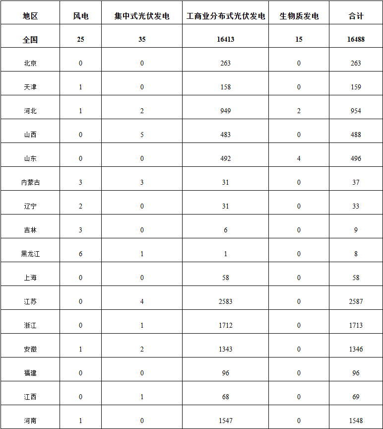 2024年11月,全國新增建檔立卡新能源發(fā)電(不含自然人戶用光伏)項(xiàng)目共16488個,其中風(fēng)電項(xiàng)目25個,光伏發(fā)電項(xiàng)目16448個(集中式光伏發(fā)電項(xiàng)目35個,工商業(yè)分布式光伏發(fā)電項(xiàng)目16413個),生物質(zhì)發(fā)電項(xiàng)目15個。風(fēng)電、集中式光伏發(fā)電、生物質(zhì)發(fā)電項(xiàng)目清單見附件,工商業(yè)分布式光伏發(fā)電項(xiàng)目清單詳見國家可再生能源發(fā)電項(xiàng)目信息管理平臺網(wǎng)站(網(wǎng)址https://djfj.renewable.org.cn/default/pub/tz/jdlknotice202411.html)。